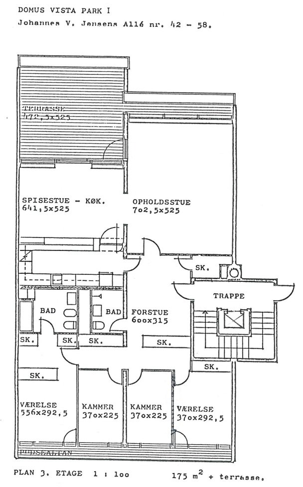 Samlet 72 lejligheder fordelt på 3 huse, 4 etager og 9 indgange. 8 lejligheder pr. indgang. Stueetagen anvendes til fælles indgang, garage, depotrum mv. Der er elevator til lejlighederne.